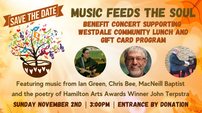 On Sunday Nov 2 at 3 pm at Westdale United Church, there was a benefit concert supporting the Westdale Community Lunch and Gift Card Program.  It featured music from Ian Green, Chris Bee, MacNeill Baptist (yes… us!) and the poetry of Hamilton Arts Awards Winner John Terpstra.  There are a few photos from the afternoon below.