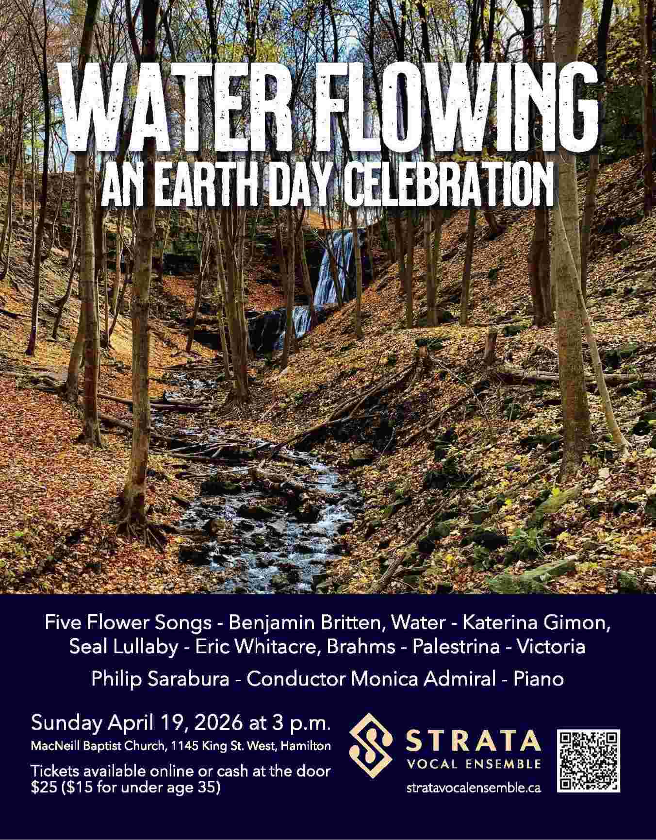 As Earth Day approaches, MacNeill’s resident chamber choir Strata Vocal Ensemble presents a program to honour the beauty around us, including Brahms’s Schaffe in Mir, Gott, ein Rein Herz (Make Me a Clean Heart, O God) and Funf Gesange (Five Songs); and Britten’s Five Flower Songs. The theme of water emerges in lovely motets by Victoria and a favourite by Palestrina, and continues in Water by Hamilton’s own Katerina Gimon, and Eric Whitacre’s touching Seal Lullaby.  Arrangements of Loch Lomond by Jonathan Quick and Flow Gently Sweet Afton by Sarah MacDonald round out an afternoon of songs to welcome spring and celebrate the exquisite and fragile beauty of Earth.  Tickets: $25 ($15 for under age 35) are available from Garth, Bev, Paula, Brian, or Monica A or cash at the door.